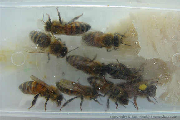 [ακόμα και μέσα στο θολό κουτάκι μεταφοράς, οι σημαδεμένη βασίλισσα του 2002 ξεχωρίζει από τις άλλες μέλισσες ]