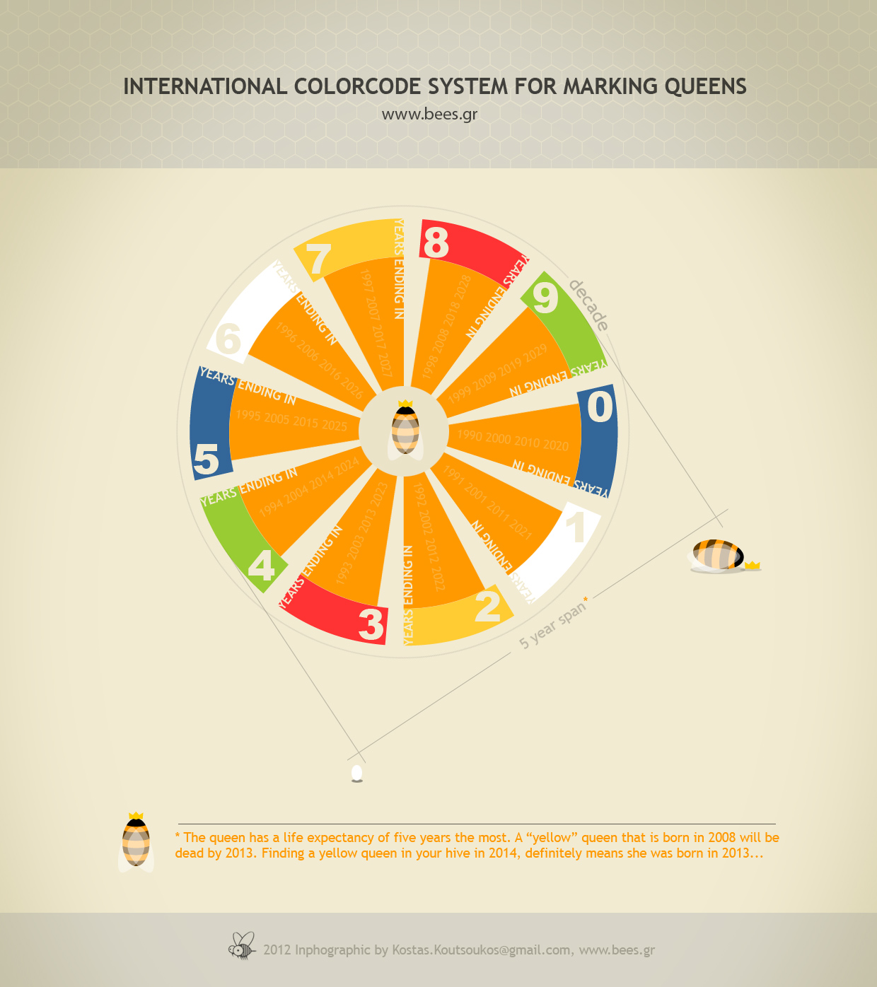 Έτσι αν την άνοιξη αποκτήσω μια νέα βασίλισσα σε ένα μελίσσι θα σημαδέψω τον θώρακα της με κίτρινο χρώμα γιατί το έτος είναι 2012. Το ίδιο χρώμα είχε χρησιμοποιηθεί τελευταία φορά το 2007, πράγμα που σημαίνει οτι αποκλείεται να να μπερδέψω εκείνες τις βασίλισσες με τη φετινή, αφού δεν υπάρχει περίπτωση να ζουν. Αν ανοίξω την κυψέλη μου το 2012 και βρω μέσα μια βασίλισσα με πράσινο χρώμα θα ξέρω ότι η βασίλισσα αυτή είναι γεννημένη το 2009 και η μεγάλη ηλικία της θα δηλώνει φωναχτά ότι πρέπει να αντικατασταθεί σύντομα. Πολλοί μελισοκόμου δεν μπαίνουν καν στον κόπο να ψάχνουν για βασίλισσες την περίοδο της βασιλοτροφίας για να δουν τις ηλικιές τους από το χρώμα και να αποφασίσουν που πρέπει να προχωρήσουν σε αντικατάσταση. Απλά καρφώνουν μια πινέζα αντίστοιχου χρώματος στην κυψέλη ή σχεδιάζουν με χρώμα ένα κύκλο. Ετσι υπενθυμίζουν στον εαυατό τους από πριν ανοίξουν την κυψέλη την ηλικία της “κατοίκου-μαμάς”