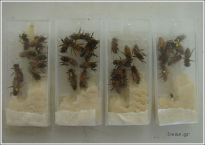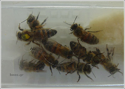Στις φωτογραφίες βλέπουμε τέτοια κουτάκια, πριν αυτα τοποθετηθούν στις κυψέλες μου, όταν πριν 1,5 χρόνια έπρεπε να κάνω κάποιες τέτοιες ενέργειες. Οι βασίλισσες ειναι στιγματισμένες με μια κίτρινη σταγόνα χρώμα στην πλάτη για να ξεχωρίζεται απο τις άλλες μέλισσες.