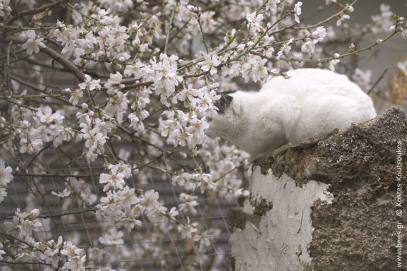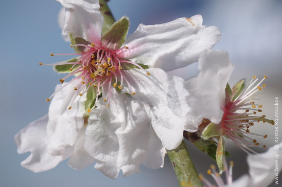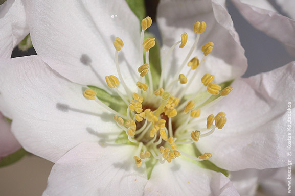 Η αμυγδαλιά του γείτονα, έχει πολλούς λόγους να κεντρίζει το ενδιαφέρον μου και αυτό το πράσινο ανάμεσα στα άνθη της δεν είναι φύλλο. Κάθε χρόνο, γύρω στις αλκυονίδες την παρατηρώ να ανθίζει. Παλιότερα απο “εικαστικό” ενδιαφέρον, τα τελευταία 10 – 12 χρόνια απο μελισσοκομικό και ανέκαθεν φωτογραφικά.
