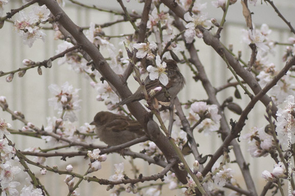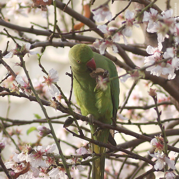 Α! και μην ξεχάσω. Το πράσινο που έλεγα στην αρχή οτι δεν είναι φύλλο, είναι ενας μόνιμος επισκέπτης των τελευταίων ημερών, που ερχεται με τον φίλο η το κορίτσι του (δεν ξερω τι ρολο βαράνε) και τρώνε τα περσινά αμύγδαλα….